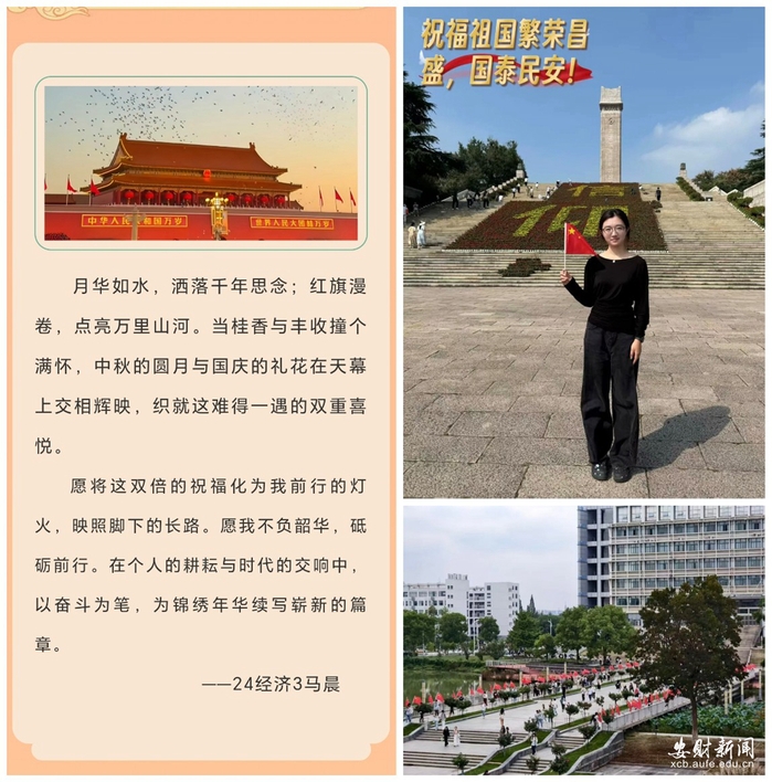 学院通过网络平台开展了一系列线上互动活动。在微信公众号平台发起“与祖国合影 为祖国祝福”“最美中秋秀起来”“最美安财拍起来”等活动,鼓励同学们用镜头记录下与国旗同框的感人瞬间、中秋佳节的温馨画面、校园秋日的美丽景致,并附上对祖国的深情祝福。在易班平台同步开展“为祖国送祝福”活动,学子们纷纷留言,表达对祖国的热爱与对未来的憧憬,线上平台洋溢着青春报国的炽热情感。