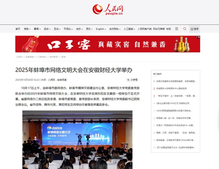 10月20日,人民网以《2025年蚌埠市网络文明大会在安徽财经大学举办》为题,报道由蚌埠市委网信办、蚌埠市精神文明建设办公室、安徽财经大学党委宣传部联合举办的2025年蚌埠市网络文明大会,在安徽财经大学龙湖东校区求真楼一楼报告厅正式开幕。大会公布了2025年全市网络文明建设优秀案例、2025年蚌埠网络文明建设优秀短视频获奖作品及蚌埠市首届网络文明建设表现突出个人名单。其中,安徽财经大学《构建“1+5”校史网络教育矩阵赋能时代新人培育》获评网络文明建设优秀案例。