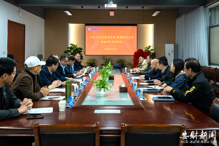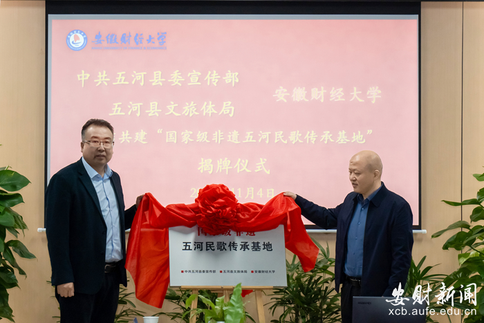 11月4日下午,安徽财经大学与五河县委宣传部校地合作签约暨国家级非遗五河民歌传承基地揭牌仪式在我校举行。校党委常委、副校长孙小龙,五河县委常委、宣传部长孟波出席会议,双方相关部门负责人,国家级非遗五河民歌传承人、艺术学院师生代表参加揭牌仪式。会议由艺术学院党委书记刘晓光主持。